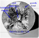 Figure 1. Melt-textured growth process being explored to fabricate grain-aligned bulk thermoelectric oxides. Also included in a top view of a melt-textured superconductor showing a planar growth front of a single solidified domain.